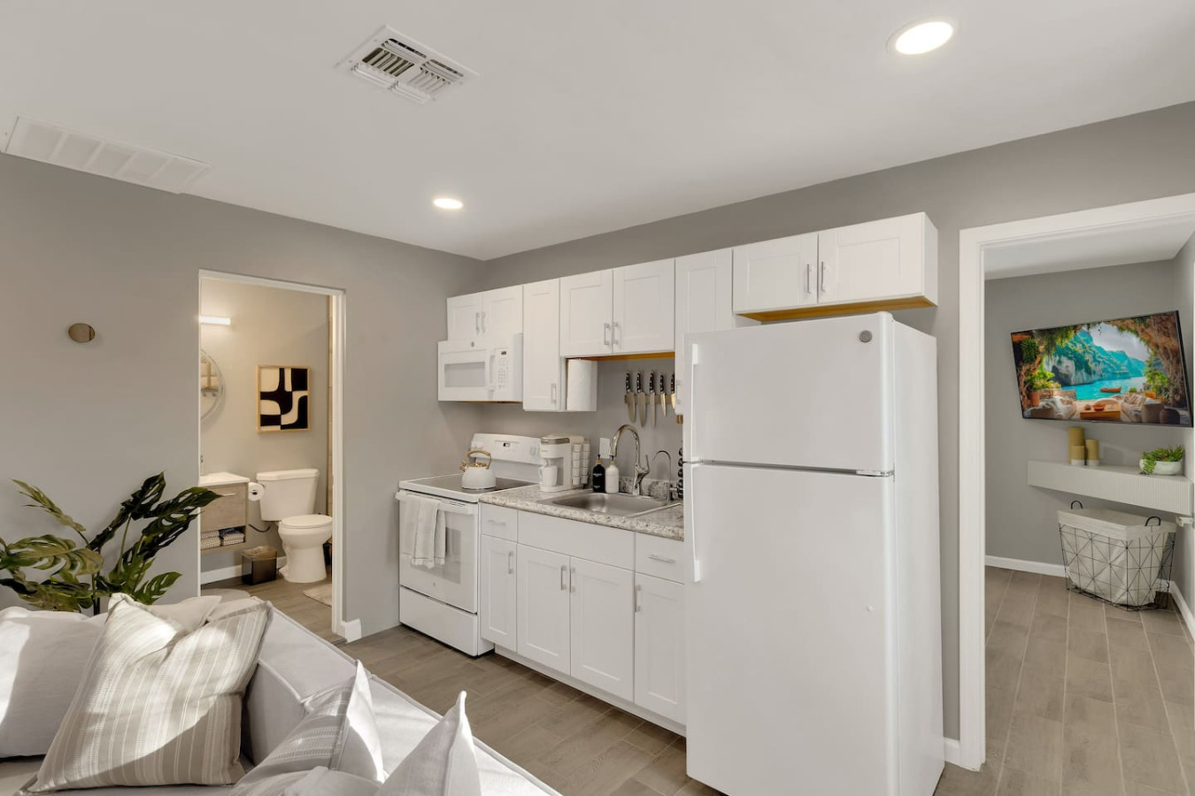 / nightKick back & relax in this calm, stylish space. Experience the perfect blend of comfort, style, and convenience in this beautifully remodeled contemporary casita. Nestled in the heart of Tucson, this private retreat offers everything you need for a relaxing&high-end stay. Enjoy the convenience of your own driveway, a separate fenced yard with an in-unit washer & dryer. Inside you'll enjoy a thoughtfully curated home with modern finishes, elegant décor, and all the comforts of home away from home.
